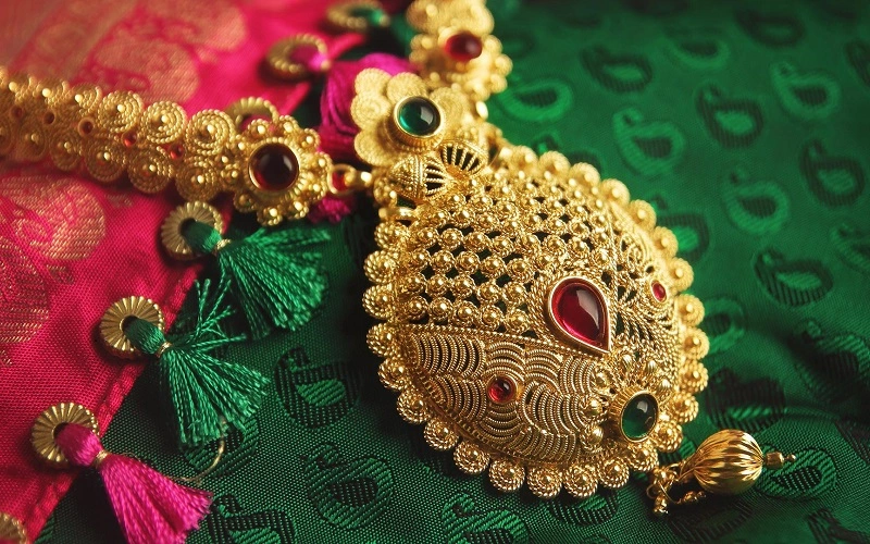 طلاهای هندی درشت و پر جزئیات هستند. دستبندها و گردنبندهای هندی، پهن هستند و معمولا قسمت زیادی از گردن و دست را میپوشانند. بسیاری از سازندگان طلای هندی، از نمادهای گیاهی در طلاهای خود استفاده میکنند زیرا فرهنگ هندی ارزش خاصی برای گیاهان قائل است. در طلاهای هندی، از سنگهای با ارزش کوچک و بزرگ در رنگهایم تنوع مانند سبز و قرمز استفاده میشود. طلای ایرانی در مقایسه با طلای هندی، ظرافت بیشتری و زردی کمتری دارد. عیار طلای استاندارد در هند 22 عیار است.